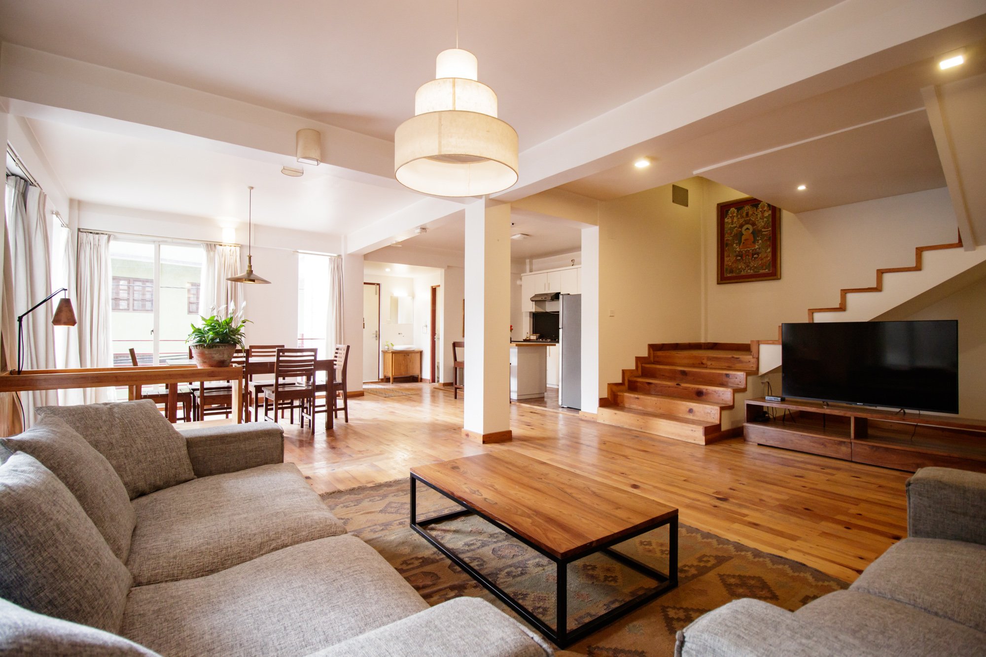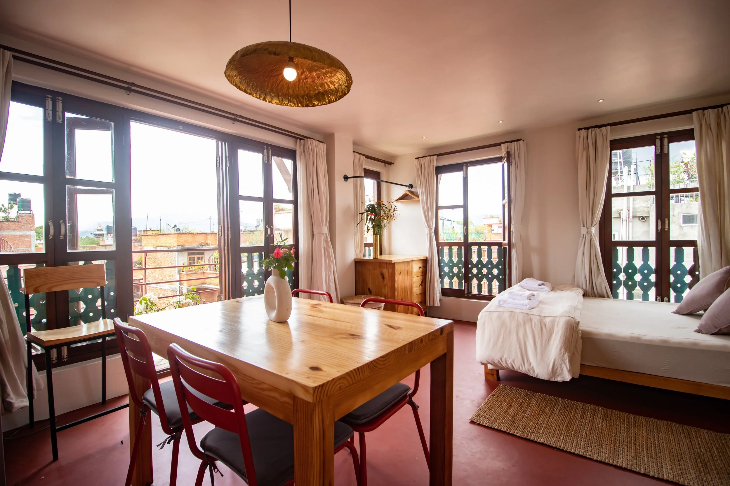 This south/ East facing duplex is a serene retreat, featuring beautiful Newari windows that fill the space with natural light and intricate light patterns throughout the day.